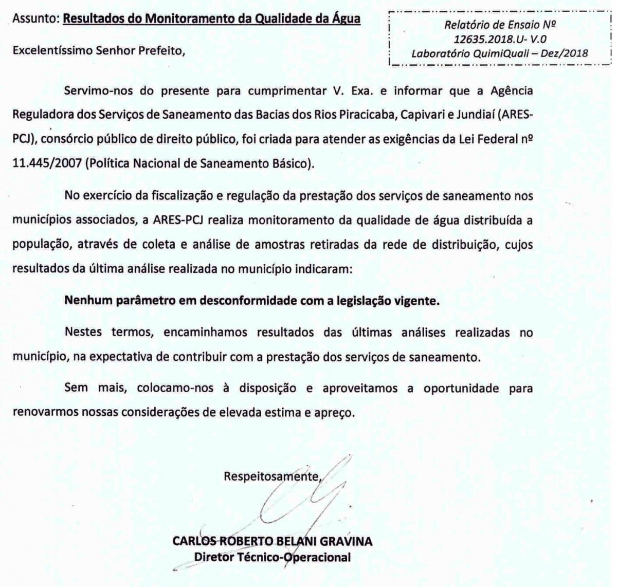 Ares PCJ certifica novamente qualidade de água distribuída em Posse