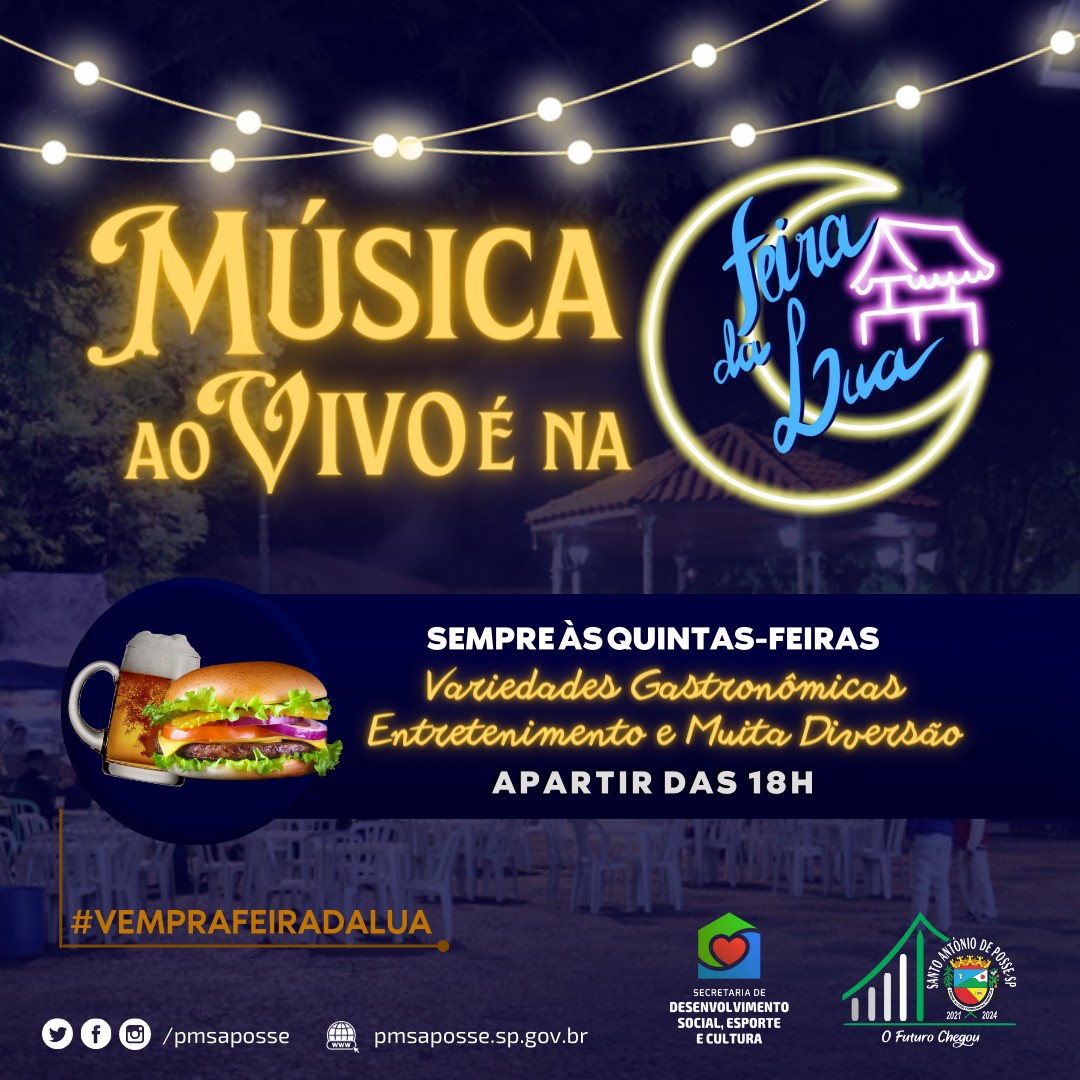 A Prefeitura de Santo Antônio de Posse, através da Diretoria de Cultura e Turismo, inaugura na quarta-feira, dia 20 de junho, a Feira da Lua. A atividade será realizada semanalmente, sempre às quartas-feiras, das 18h às 22h, na Praça Coronel Da...